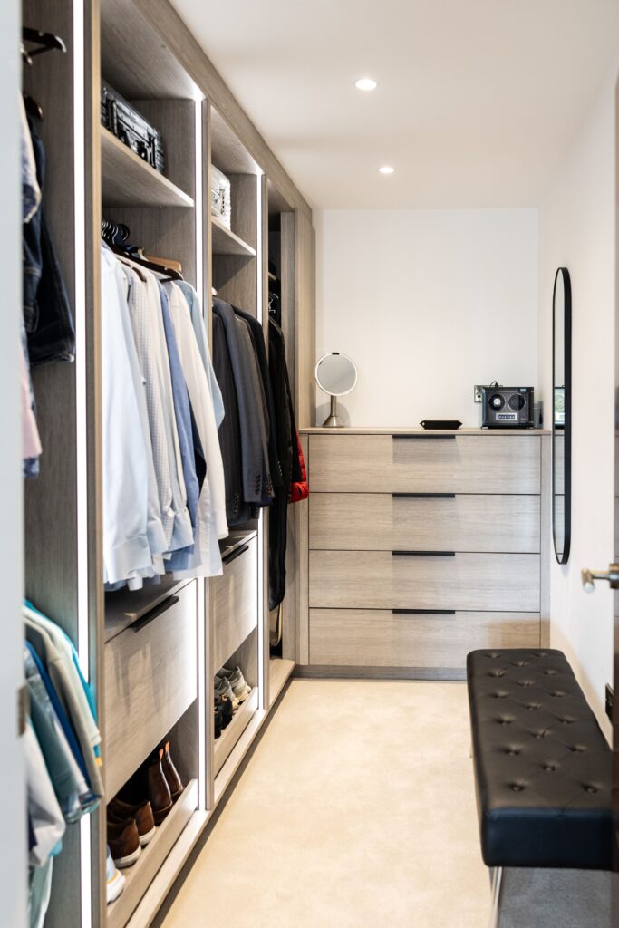 Upstairs, the dressing rooms each have their own style and meets the needs of our customer, including storage solutions to match their clothes, shoes and accessories