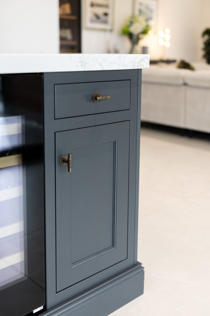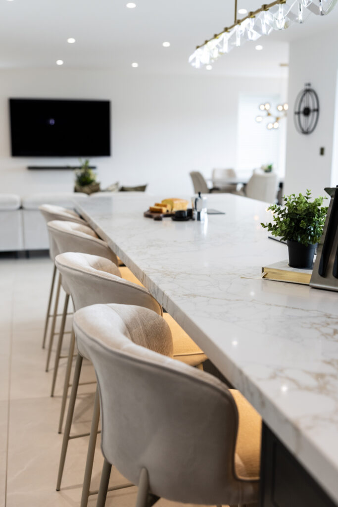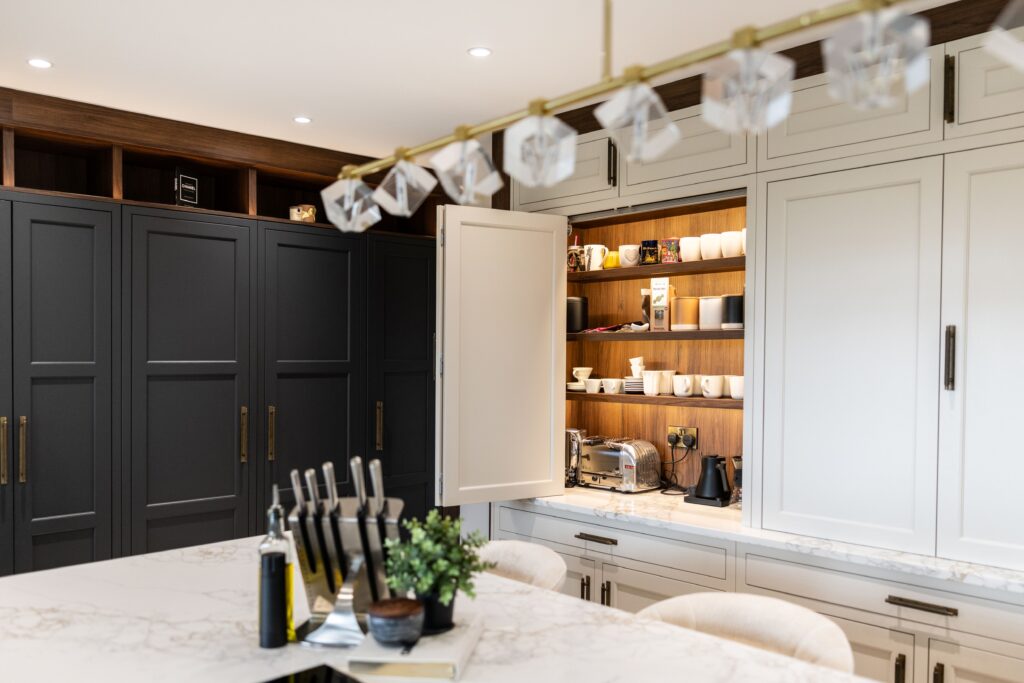 The Kitchen needed to maximise storage and created a family space which was also ideal for cooking and entertaining. The oversized island fills the kitchen area, with seating on one side, in front of the coffee and drinks dressers.