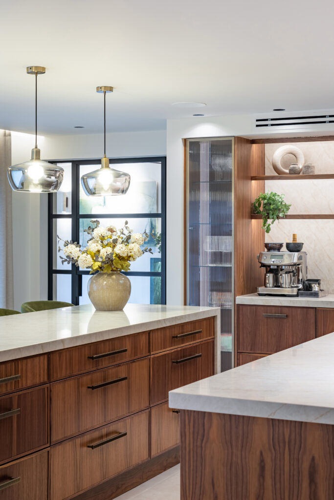 Modern and timeless kitchen with aluminium brass framed glazed units and double island for cooking and entertaining.